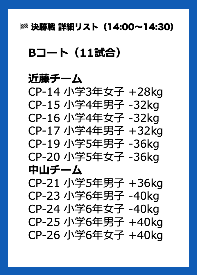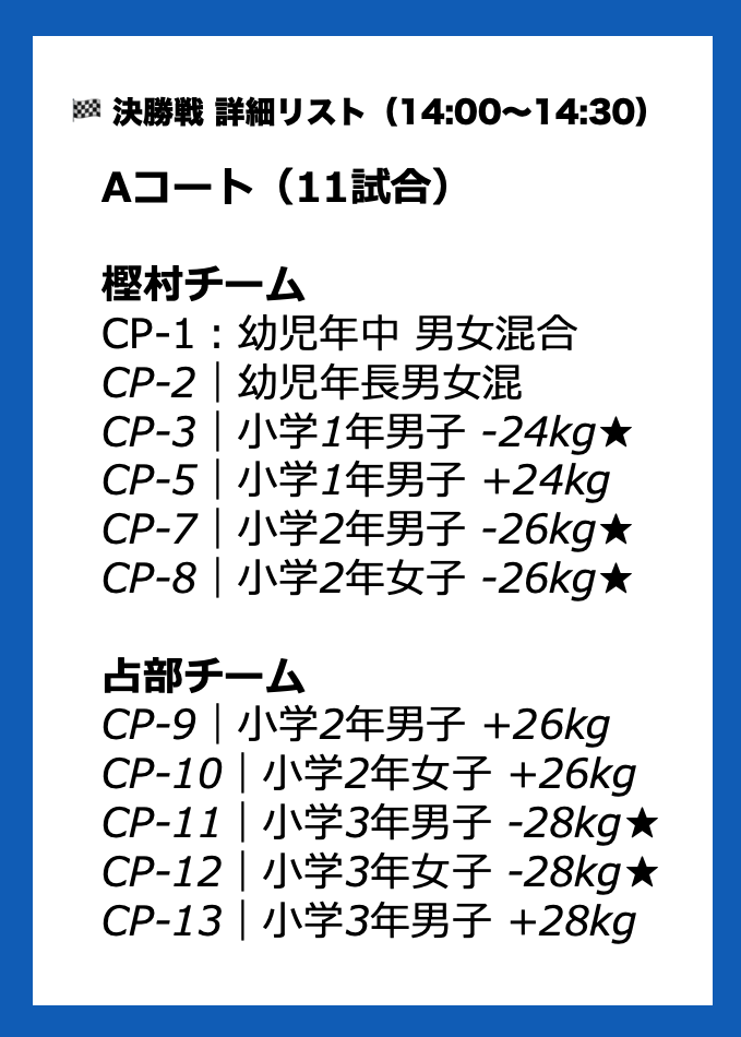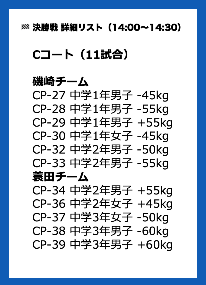 ※体重測定が必要なクラス選手のみ試合開始までに体重測定を済ませてください。